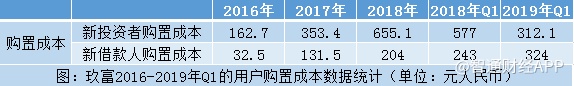 其次,用户的购置成本越来越高,若继续扩张将影响公司的利润表。智通财经APP发现,玖富的新投资者购置成本从2016年的162.7元每人增至2018年的655.1元每人,虽然2019年一季度时下滑至312元,但持续性存疑。与此同时,新借款人的购置成本从2016年的32.5元增至2018年的204元,2019年一季度则同比增长33%至324元,扩张成本越来越高。