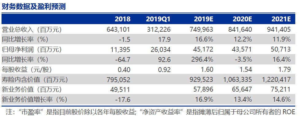 投资建议:全年价值口径量价改善趋势确立。预计全年总保费达5857.05亿元,同比增长9.3%,NBV1H19同比增速为18%(增速大幅领跑上市险企),全年为16.9%,受益于所得税返还和投资回报偏差(预计约为158.8亿元)共振影响,全年EV同比增速达16.9%。结合所得税新规影响、中报预告和权益市场变化,我们调整盈利预测,预计公司19-21年归母净利润同比增速分别为451.72、435.71和507.13亿元,同比增速为296.4%、-3.5%和16.4%(上期预测426.35亿元、450.83和504.74亿元),ROAE由上年同期的3.6%提升至13.3%(创出2011年以来新高)当前收盘价对应19至21年PEV分别为0.91X、0.80X和0.69X,当前估值处于历史16%分位数,维持增持评级。