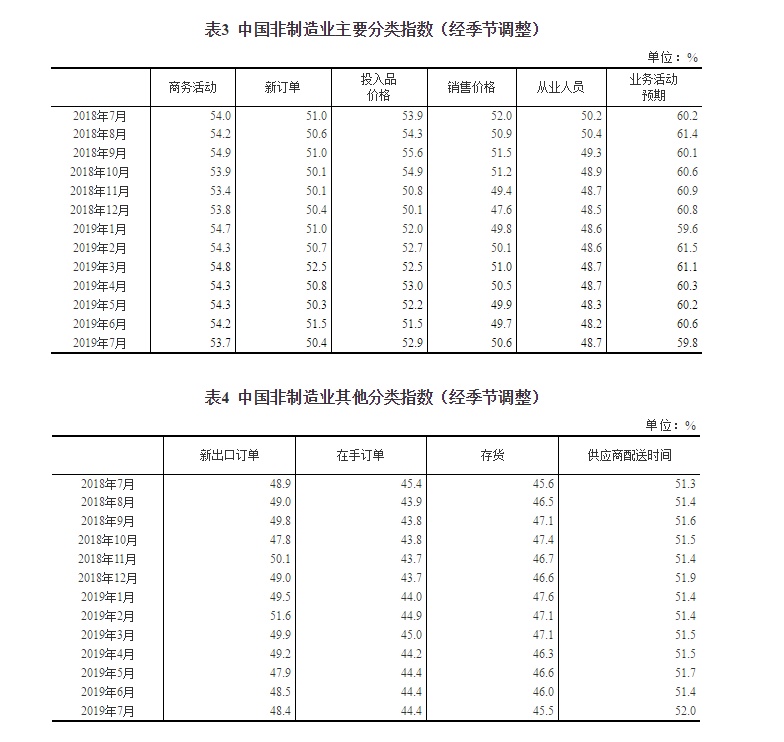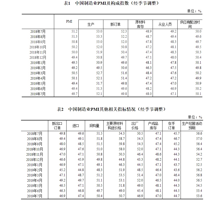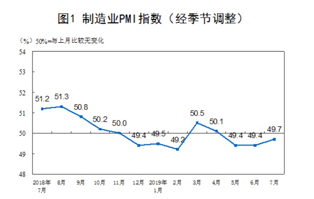 智通财经APP获悉,7月31日, 国家统计局公布数据显示,2019年7月份,中国制造业采购经理指数(PMI)为49.7%,比上月提高0.3个百分点,制造业景气水平有所回升。中国非制造业商务活动指数为53.7%,比上月回落0.5个百分点,位于扩张区间。