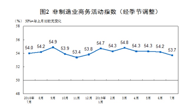 2019年7月份,中国非制造业商务活动指数为53.7%,比上月回落0.5个百分点,位于扩张区间。