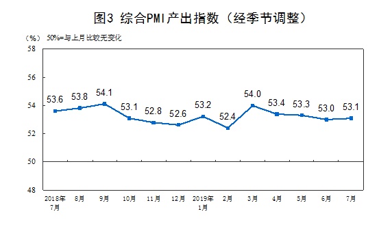 2019年7月份,综合PMI产出指数为53.1%,比上月微升0.1个百分点,表明我国企业生产经营活动稳步扩张。