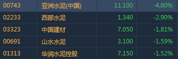 智通财经APP获悉,全国水泥价格连续8周环比下滑,水泥股全线下跌,亚洲水泥(中国)(00743)领跌板块。截至10时49分,亚洲水泥(中国)跌4.8%,报价11.1港元,西部水泥(02233)跌2.9%,中国建材(03323)跌1.81%,山水水泥(00691)跌1.59%,华润水泥(01313)跌1.52%。