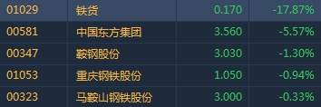 智通财经APP获悉,据中钢协数据显示,今年上半年钢铁产量大幅增长,钢铁企业效益却大幅下滑。钢铁股集体走弱,截至11时05分,铁货(01029)跌17.87%,报价0.17港元,中国东方集团(00581)跌5.57%,报3.56%,鞍钢股份(00347)跌1.3%,马鞍山钢铁(00323)跌0.33%。