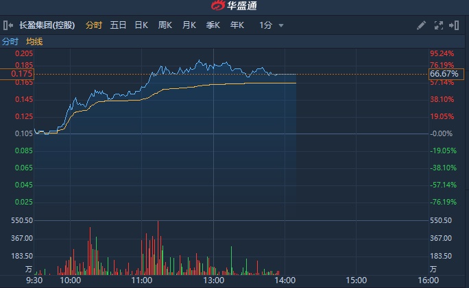 智通财经APP获悉,长盈集团(控股)(00689)早盘开始放量暴涨,盘中最高涨82%。截至发稿,涨66.67%,报0.175港元,成交额2751万港元。
