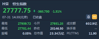 智通财经APP获悉,恒指早盘低开215.22点或0.76%,报27931.28点。截至收盘,恒生指数跌368.75点或1.31%,报2777.75点,全日成交额达602.98亿。国企指数跌1.32%,报10675.31点,红筹指数跌1.22%,报4340.77点。