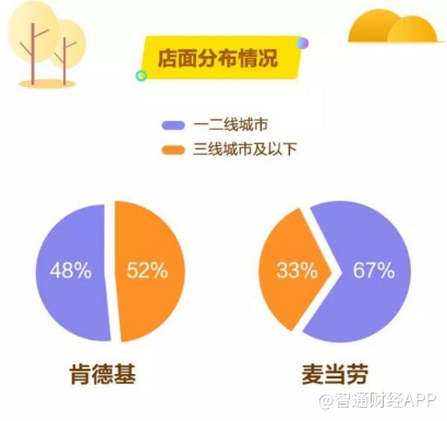 在渠道下沉方面,根据官网数据截止目前,肯德基在中国的店面数量超过6000家,而同期麦当劳的数量仅为3152家。并且从店面分布情况来看,肯德基目前已实现52%的店面下沉至国内3线城市及以下,相较而言,麦当劳三线城市下沉店面只有33%。所以明显可以看出,三四线小城市的市场,肯德基、麦当劳都在抓,但肯德基走得更彻底,而这也是肯德基近年来能飞速发展的根本原因。