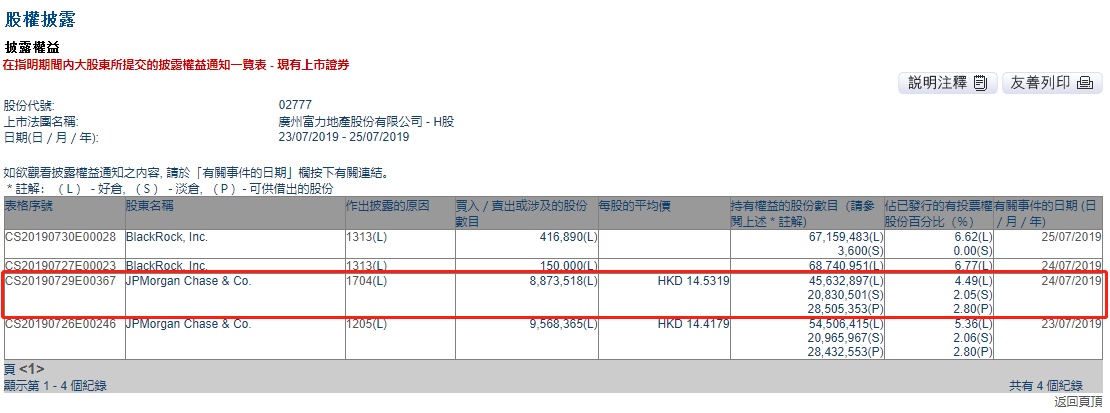 智通财经APP获悉,联交所最新资料显示,摩根大通于7月24日对富力地产(02777)减持887.35万股,每股平均价14.5319港元,涉及总金额约为1.29亿港元。减持后摩根大通最新持股数目约为4563.29万股,最新持股比例为4.49%。