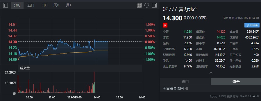 截至今日收盘,富力地产(02777)无涨跌,报14.3港元。