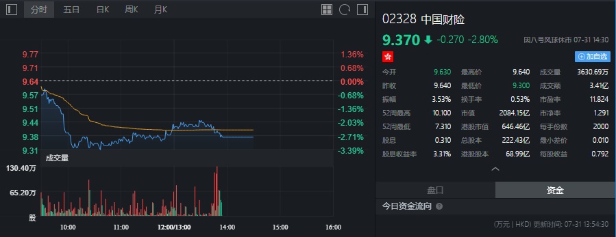 截至今日收盘,中国财险(02328)跌2.8%,报9.37港元。