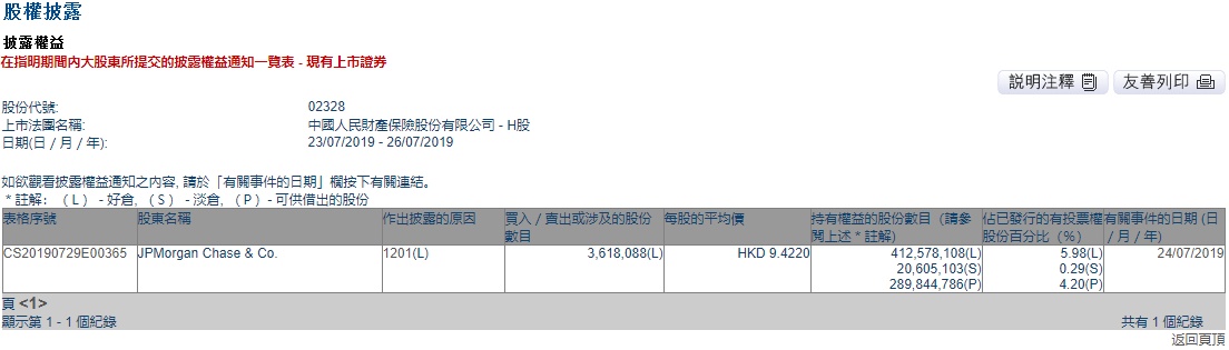 智通财经APP获悉,联交所最新资料显示,摩根大通于7月24日对中国财险(02328)减持361.81万股,每股平均价9.422港元,涉及总金额约为3408.96万港元。减持后摩根大通最新持股数目约为4.13亿股,最新持股比例为5.98%。