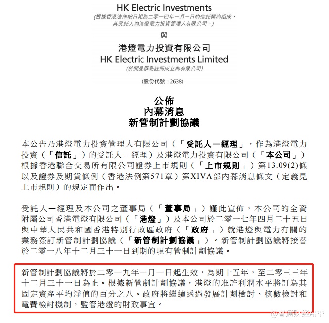 智通财经APP查阅资料发现,2017年4月25日,港灯与其全资附属公司香港电灯有限公司,与香港特别行政区政府就港灯与电力有关的业务签订新管制计划协议。新管制计划协议将接替于2018年12月31日到期的现有管制计划协议。