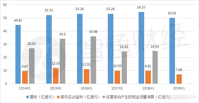 二是业绩,2014年中期以来,港灯营业收入从44.81亿港元(下同),增长至2019年中期的50.03亿元,期间年均复合增长率为2.23%;股东应占净利润从9.67亿元下降至7.09亿元,期间年均复合增长率为-6.02%,同样稳定。