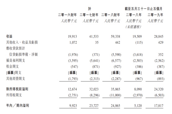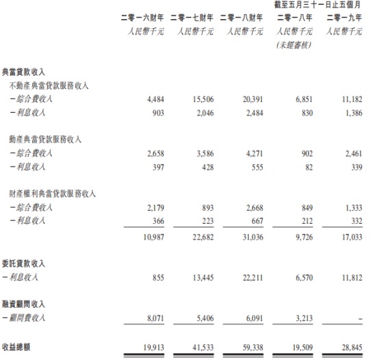 于2016年财年、2017财年、2018财年及截至2019年5月31日止5个月,公司收入分别约为1991.3万元、4153.3万元、5933.8万元及2884.5万元人民币。收入主要来自向客户提供典当贷款收取综合费及利息;根据本集团(作为委托人)、银行(作为贷款人)与客户(作为借款人)间的委托贷款协议向客户提供委托贷款收取利息;通过提供融资顾问服务从客户收取的顾问费。同期的年内溢利分别为992万元,2373万元,2487万元和1782万元;净利润分别为约990万元、2370万元、2490万元及1810万元人民币;净利润率分别为49.8%,57.1%,41.9%和61.8%。利息收入净额分别为250万元、1610万元、2590万元及1390万元人民币。
