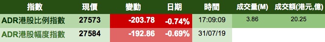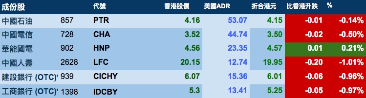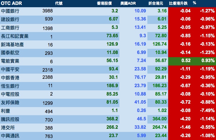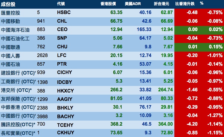 智通财经APP获悉,美股收市下挫,港股ADR指数全日受压,按比例计算,收报27573点,跌203.78点或0.74%。大型蓝筹股全线向下,汇丰控股收报62.87元,较港收市跌0.48元;腾讯控股收报364元,较港收市跌4.2元。