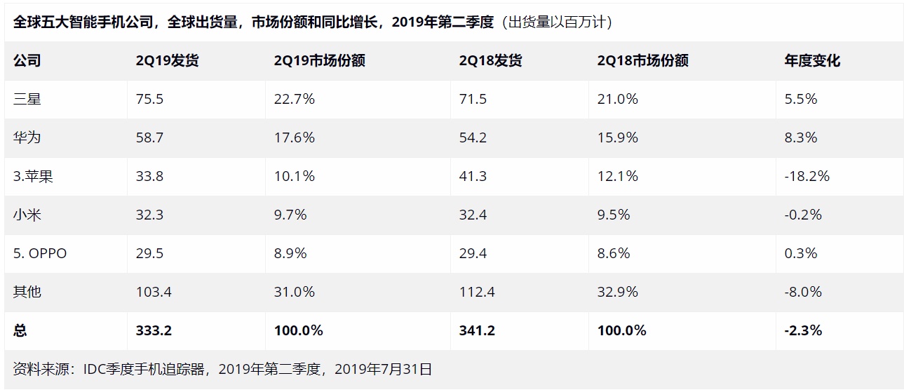 OPPO位居第五,第二季度总出货量为2950万部,与去年同期的2940万部相比增长0.3%;在整体市场上所占份额为8.9%,高于去年同期的8.6%。