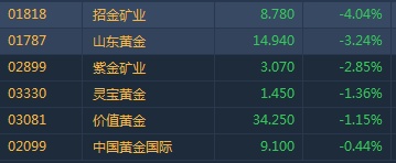 智通财经APP获悉,美联储“鹰派降息”刺激美元飙升,国际金价承压下跌,拖累港股黄金板块全线走弱,截至11时12分,山东黄金(01787)跌3.24%,紫金矿业(02899)跌2.85%,中国黄金国际(02099)跌0.44%。
