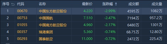智通财经APP获悉,受国际油价上涨影响,航空股集体下挫。截至发稿,中国东方航空股份(00670)跌2.76%,报4.23港元,成交额4523.91万港元;中国南方航空股份(01055)跌2.37,报4.95港元,成交额6400.91万港元;中国国航(00753)跌2.34%,报7.51港元,成交额7143.41万港元。