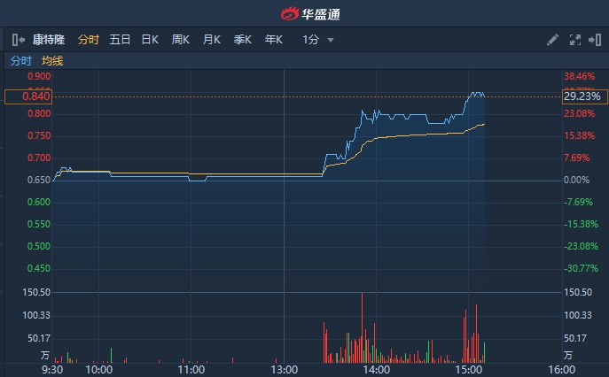 智通财经APP获悉,康特隆(01912)午盘后出现量价异动,直线拉升近30%。截至发稿,涨30.77%,报0.85港元,成交额2078.79万港元。有望突破前期0.89港元前高。