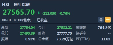 智通财经APP获悉,恒指早盘低开195.54点或0.7%,报27582.21点。截至收盘,恒生指数跌212.05点或0.76%,报27565.7点,全日成交额达799.81亿。国企指数跌0.5%,报10621.57点,红筹指数跌0.6%,报4314.77点。