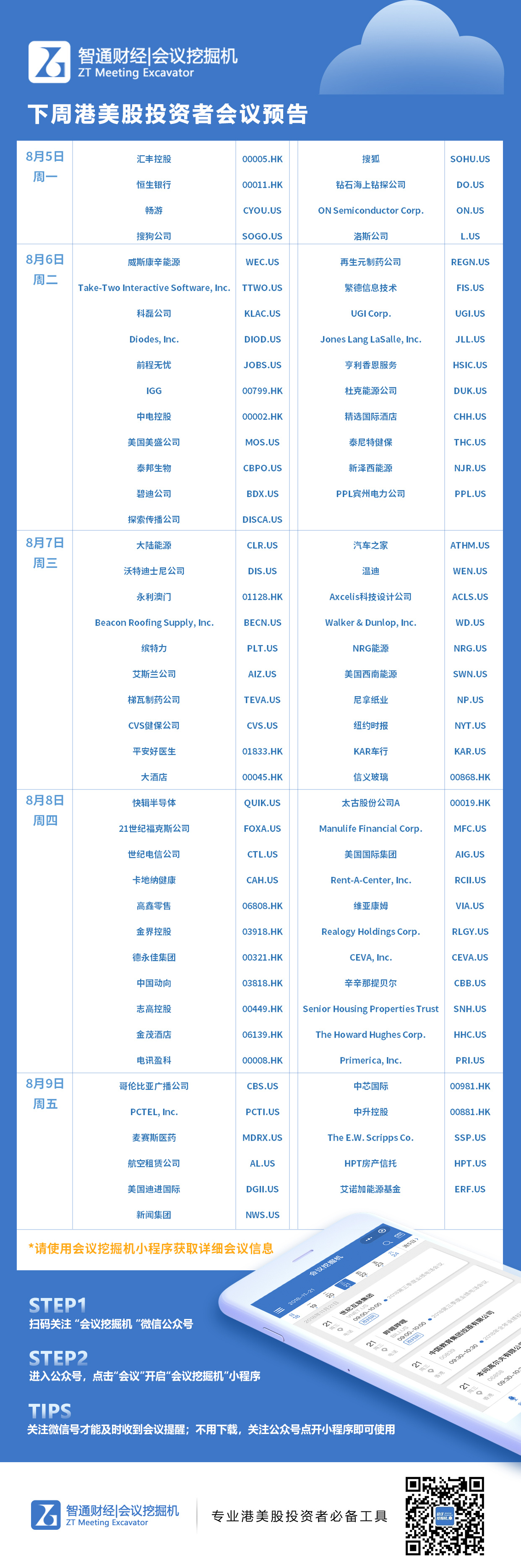 以下是智通财经“会议挖掘机”为您整理的下周(8月5日-8月9日)港美股上市公司会议日历。