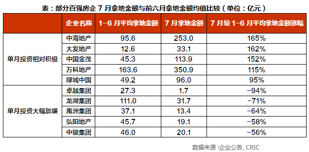 1-7月货值破千亿的企业仍然只有14家,与上月相比没有增加,整体投资步伐放缓,其中卓越,弘阳等企业单月拿地金额均小于其上半年均值。城市选择上,百强房企新增土储中有50%建面位于一、二线城市,投资逐步聚焦高能级城市,例如中梁等此前专注三四线的企业持续在二线落子。综合而言,目前土地市场已出现拐点,房企投资仍需更加谨慎和聚焦,警惕土拍过热的核心城市未来调控风险。