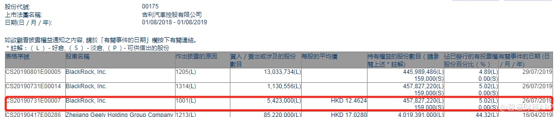 智通财经APP获悉,联交所最新资料显示,7月26日,贝莱德增持吉利汽车(00175)542万股,每股作价12.46港元,总值约为6755万港元,最新持股数目约为4.58亿股,最新持股比例为5.02%。