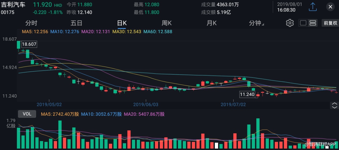截至今日收盘,吉利汽车(00175)跌1.81%,报11.92港元。