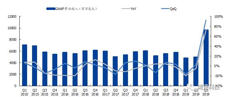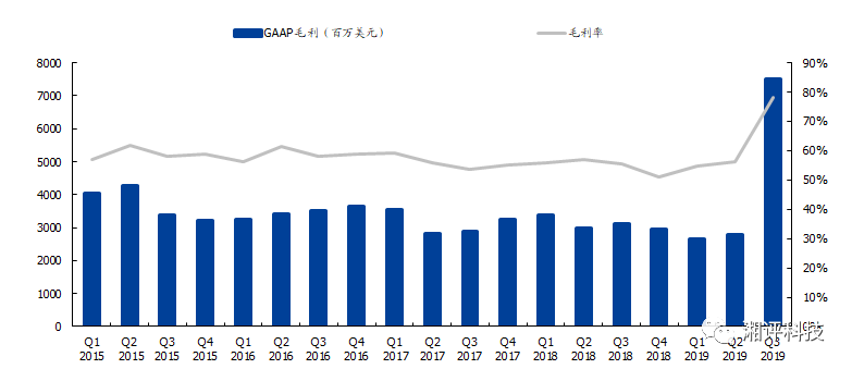 高通发布2019财年第三财季(对应19年第二季度)财报,本季GAAP营收96.35亿美元,同比上涨73%,环比上涨93%,其中47亿美元为二季度与苹果达成和解获得的专利收入,占总营收的48%。公司整体毛利率为78.10%,同比增长22.54%,环比增长21.80%。公司第三财季实现净利润21.49亿美元,同比上涨76.3%, 净利率为22.3%,同比基本保持不变,环比增长9%。剔除47亿美元二季度与苹果达成和解获得的专利收入及其他因素后,本季度非GAAP营业收入为48.94亿美元,同比下降13%,同比基本不变,净利润为9.82亿美元,同比下降34%,环比上升5%。GAAP每股收益为1.75美元,同比增长116%,未及市场预期的3.81美元,非GAAP每股收益为0.8美元,同比下降20%,未及市场预期的0.83美元。