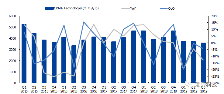 2.分部门来看,QCT部门实现营收35.67亿美元,同比下降12.72%,环比下降4.16%。其中MSM芯片出货量达1.56亿台,出货量较上季度基本持平。