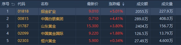 截至发稿,招金矿业(01818)涨5.24%,报9.03港元,成交额1692.16万港元;山东黄金(01787)涨4.21%,报15.36港元,成交额1864.71万港元;中国白银集团(00815)涨2.94%,报0.7港元,成交额274.04万港元。