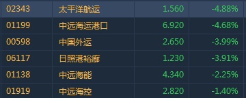 智通财经APP获悉,港口船运股随A股集体走弱,截至10时39分,太平洋船运(02343)跌4.88%,报价1.56港元,中远船运港口(01199)跌4.68%,中国外运(00598)跌3.99%,中远船能(01138)跌2.25%。