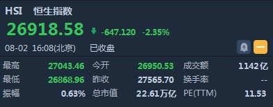 智通财经APP获悉,恒指早盘低开615.17点或2.23%,报26950.53点。全日横盘震荡,截至收盘,恒生指数跌647.12点或2.35%,报26918.58点,全日成交额达1142.62亿。国企指数跌2.57%,报10348.63点,红筹指数跌2.53%,报4205.62点。