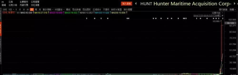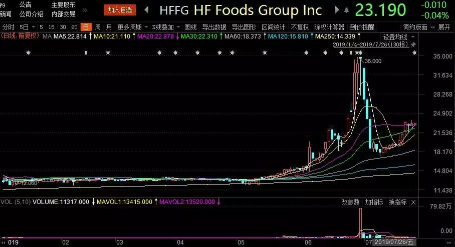 而另一家于2018年8月完成SPAC上市的中概股——合丰食品集团公司(NASDAQ:HFFG),2019年5月起,股价开始显现出明显的拉升,并于6月达到最高点,涨幅达到300%,其后则迅疾下杀,割得一手好韭菜: