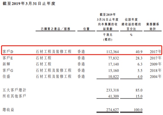 公司的主要客户是香港总承建商。截至2019年3月31日止年度,公司的前五大客户共占公司总收益的85.0%,而 其中最大客户占公司总收益 的40.9% 。
