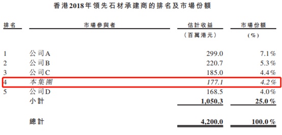 截至2018年,前五大市场参与者佔总市场份额约25.0% 。根据骏裕控股有限公司截至2019年3月31日止年度的石材工程项目及採购石材及其他材料所录得的收益为约177.1百万港元及于2018年,香港石材市场的总市场规模为约42亿港元,根据弗若斯特沙利文报告,公司于香港石材承建商中排名第四,于2018年的市场份额为约4.2%。