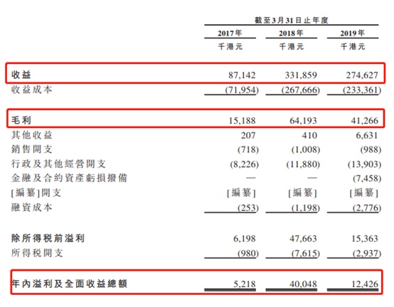 截至2019年3月31日止年度,公司的收益为27462.7万港元,同比下滑17%;归属于公司股东的应占溢利以及全面收益总额为1242.6万港元,同比下滑69%。