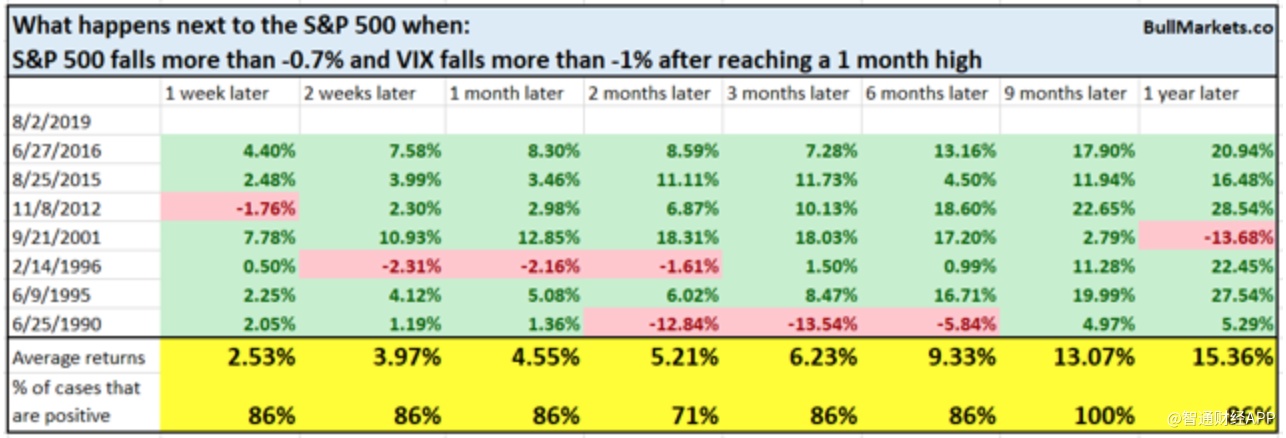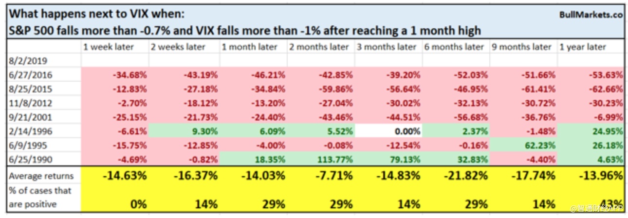 下图是当标普500一天下跌超过0.7%,而VIX下跌超过1%。