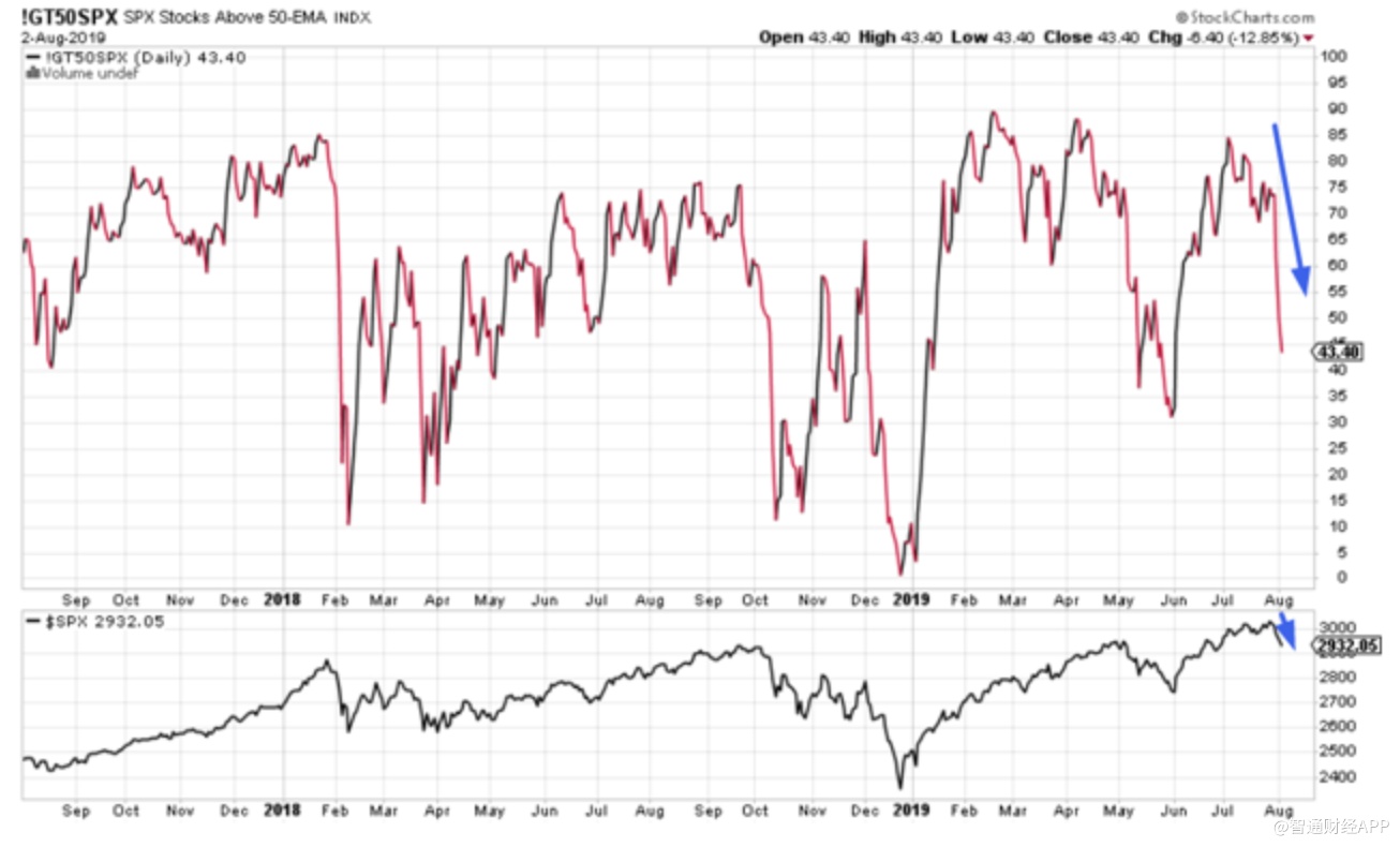 在过去的几天里,股票市场迅速下跌。因此,标普50 EMA 以上的股票也迅速下跌。在短短3周内,这一比例从80%以上到了45%以下。