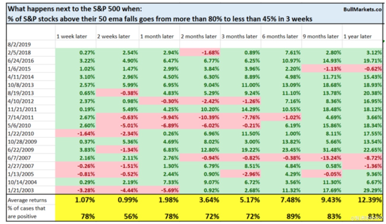 过去,当标普股价在50 DMA以上的跌幅如此之快时,之后的几周股市通常会出现反弹。
