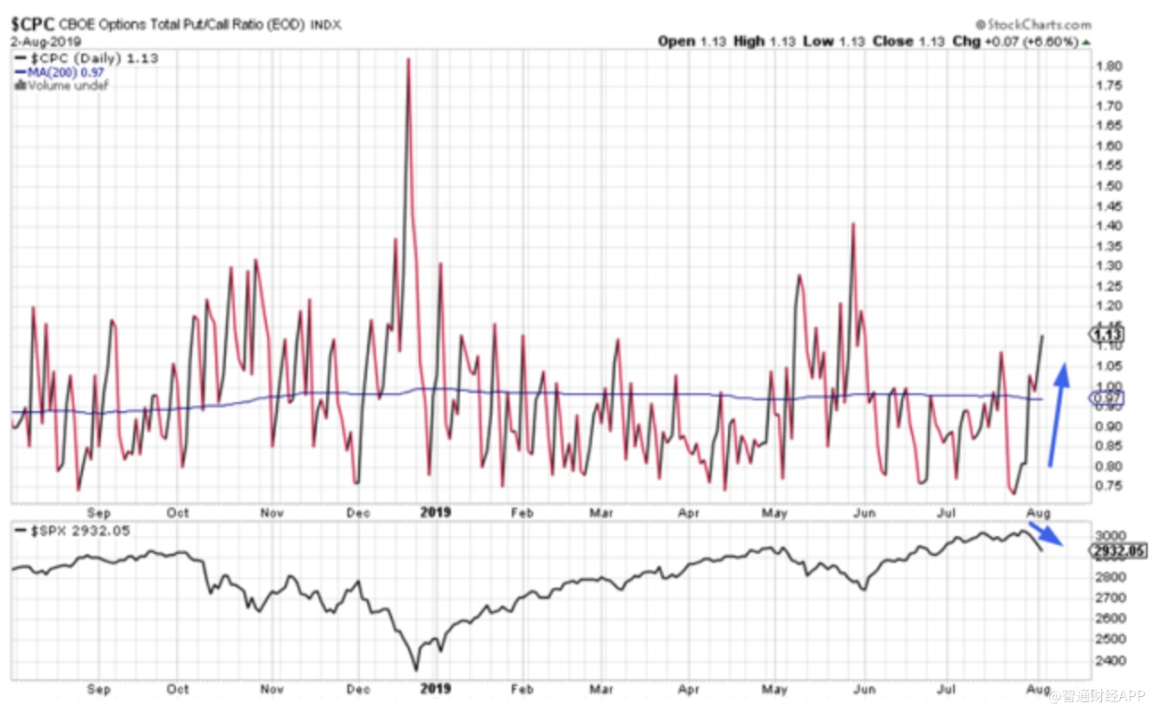 股票下跌后,看跌/看涨比率呈上升趋势。看跌/看涨比率现在已经超过其200日均线的15%,这是自5月份以来的首次。