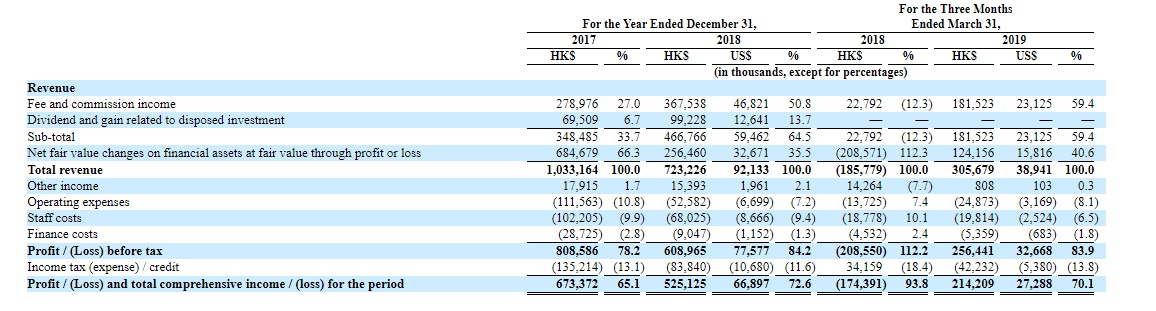 根据招股书显示,2017年,公司营收为10.33亿港币,净利润6.73亿港币。2018年公司营收打7.23亿港币,净利润为5.25亿港币。2019年第一季度营收3.05亿港币,净利润为2.14亿港币。尚乘集团从其投资的银行客户支付费用和佣金中获得了大部分收入,这些费用和佣金通常在成功完成特定交易后支付。截至2017年、2018年以及2019年3月31日,尚乘集团投资银行业务的收入分别占总收入的20.1%,39.9%及49.0%。