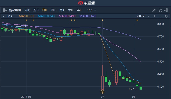 据悉,此前酷派停牌两年半,于7月19日复牌,复牌当日暴跌46.53%。股价稍有反弹后走出七连阴,今日盘中创近10年新低。