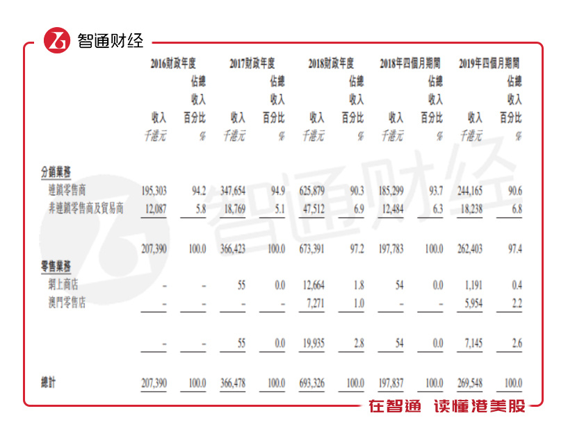 从业务上看,分销业务是该公司的核心业务,往年收入占比超过95%,其中核心的收入来源于连锁零售商,往年收入占比超过90%。该公司2018年打造线上销售,并在澳门有两家零售店,分出零售业务,但目前该业务收入占比非常小,2018年仅为2.8%。