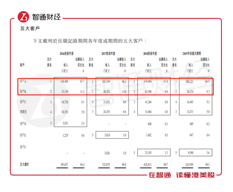 值得注意的是,我们看到该公司的客户集中度非常高,最大客户往年对该公司的收入贡献接近70%,2018财年为66.9%,前四大客户对收入的贡献往年均超过87%,且这四大客户往年的收入占比竟然均非常的稳定。