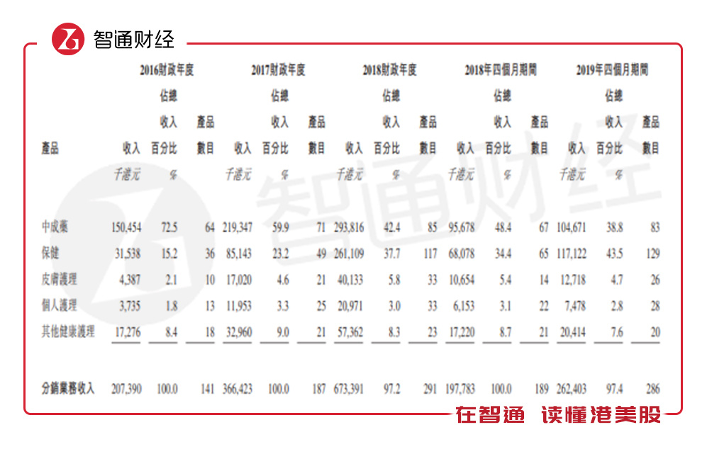 智通财经APP了解到,满贯集团分销的产品分为中成药、保健品、皮肤护理、个人护理以其他健康护理产品。从往年数据看,该公司核心产品是中成药和保健品,其中中成药产品收入占比逐年降低,而保健产品收入占比逐年增加,2018年这两项产品收入占比分别为42.4%和37.7%,2019年首四个月,保健品收入贡献超过中成药。