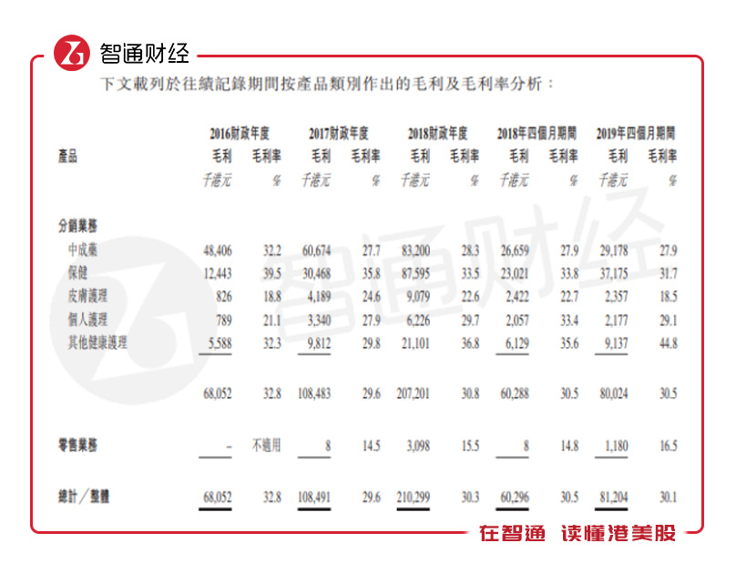 近三年,该公司的中成药、保健品、皮肤护理、个人护理收入复合增长率分别为39.7%、187.7%、202.5%以及461.4%,后面两种产品复合增速较高,但收入占比较低,目前对收入不构成显著性影响。