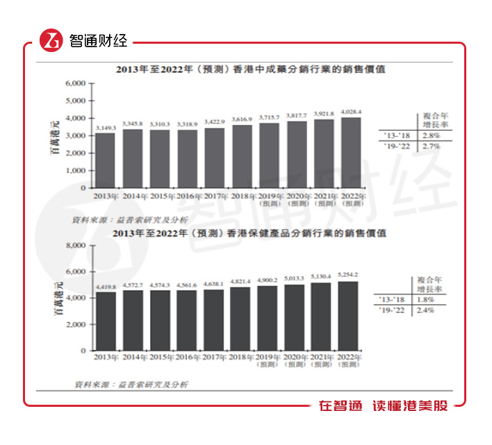就中成药来说,2018年香港地区分销行业的市场规模仅为36.17亿港元,近五年的复合增长率仅为2%,而香港的保健品分销行业也不容乐观,2018年市场规模48.21亿港元,近五年复合增长率仅为1.3%。香港这个小众暴利的市场,能给到该公司的发展空间已经很小了。