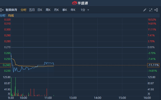 智通财经APP获悉,智美体育(01661)于8月2日发布盈警称,预期2019年上半年业绩出现亏损。股价盘中跌逾15%,创历史新低。截至发稿,跌9.63%,报0.244港元,成交额196.78万港元。