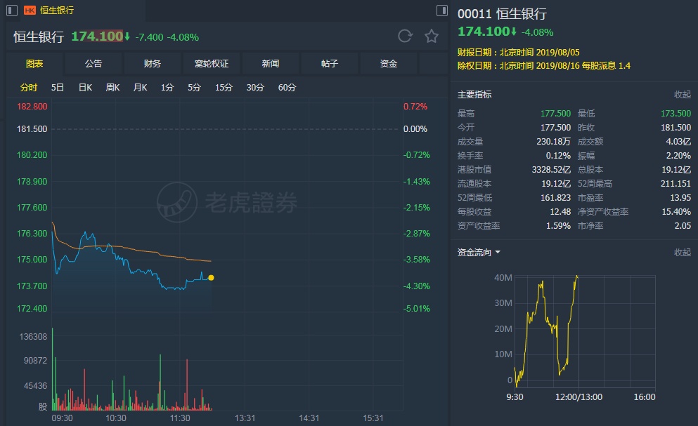 该行还表示,恒生派每股中期息2.8港元,符合该行预期,较2018年上半年每股2.6港元为高。今年上半年净利息收入仅158.53亿港元,上半年同比持平(年同比增长11%),逊市场预期2%,其净息差2.21%,上半年同比收窄5个基点,较该行原预期低8个基点。