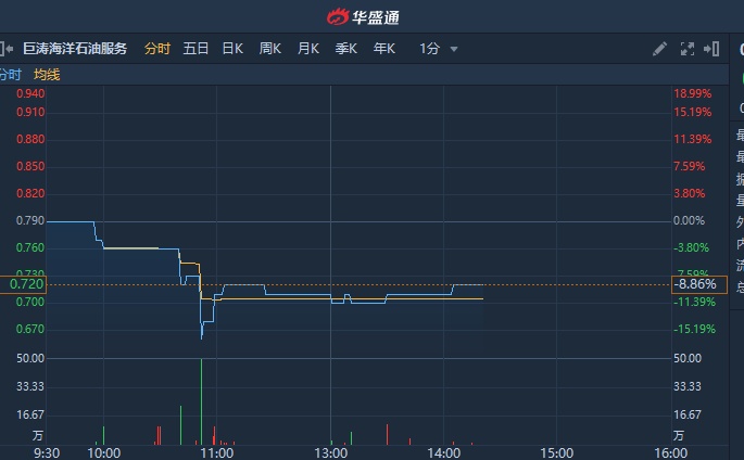 智通财经APP获悉,巨涛海洋石油服务(03303)发布盈警,预计中期取得较大额股东应占亏损。截至发稿,跌8.86%,报0.72港元,成交额132.37万,股价创一年新低。